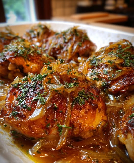Pollo Braseado en Sidra con Cebollas Caramelizadas y Hierbas