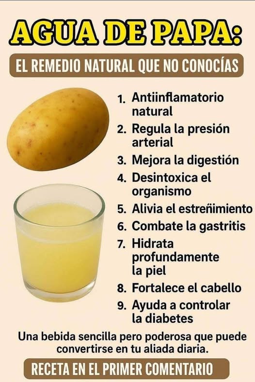El agua de papa es un remedio natural muy usado en la medicina casera por sus propiedades nutritivas y curativas. Se obtiene al hervir o remojar papas en agua, y concentra parte de sus vitaminas, minerales y antioxidantes. Aquà tienes sus principales beneficios: