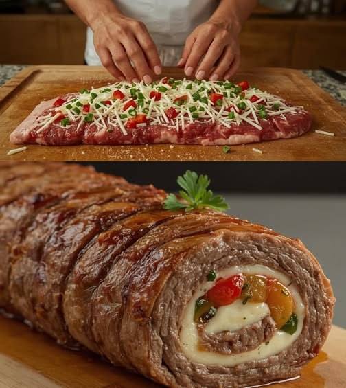 🥩 La carne rellena al horno es un plato espectacular que combina jugosidad, aroma y una presentación digna de las mejores celebraciones. Desde el primer corte, deja ver un relleno colorido y apetitoso que invita a probarlo, mientras su aroma envuelve toda la cocina. Ideal para quienes disfrutan de sabores intensos y combinaciones irresistibles.