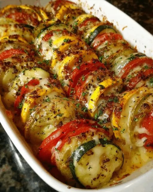 Esta colorida cazuela de tomate, papa, calabacín y calabacín es un reconfortante plato horneado que rinde homenaje a las verduras sencillas con capas de hierbas, ajo y queso. Es saludable y a la vez un capricho, perfecto como guarnición o como plato principal vegetariano ligero. El horneado lento permite que las verduras se ablanden a la perfección mientras la superficie se dora y burbujea.
