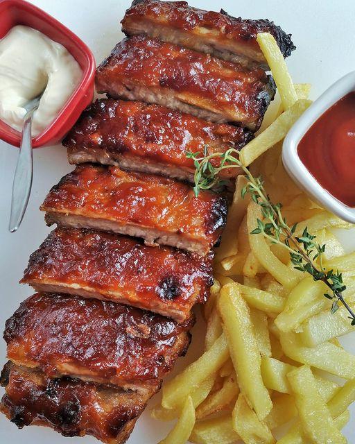 Tras una semana de obras en la cocina, comiendo más bocadillos que cuando estaba en el instituto, hoy he preparado unas riquísimas costillas con salsa barbacoa al horno. El sabor de la carne macerada, bien jugosa, con la propia salsa es realmente espectacular… y el olor que desprenden, ese mejor ni te lo cuento. Vamos, que te puedes meter un costillar entre pecho y espalda sin enterarte. Es viernes y el cuerpo lo sabe, así que hoy nos vamos a dar un pequeño gran homenaje para la cena junto a una buena botella de vino tinto y con todo el fin de semana por delante… Let’s go party!!!