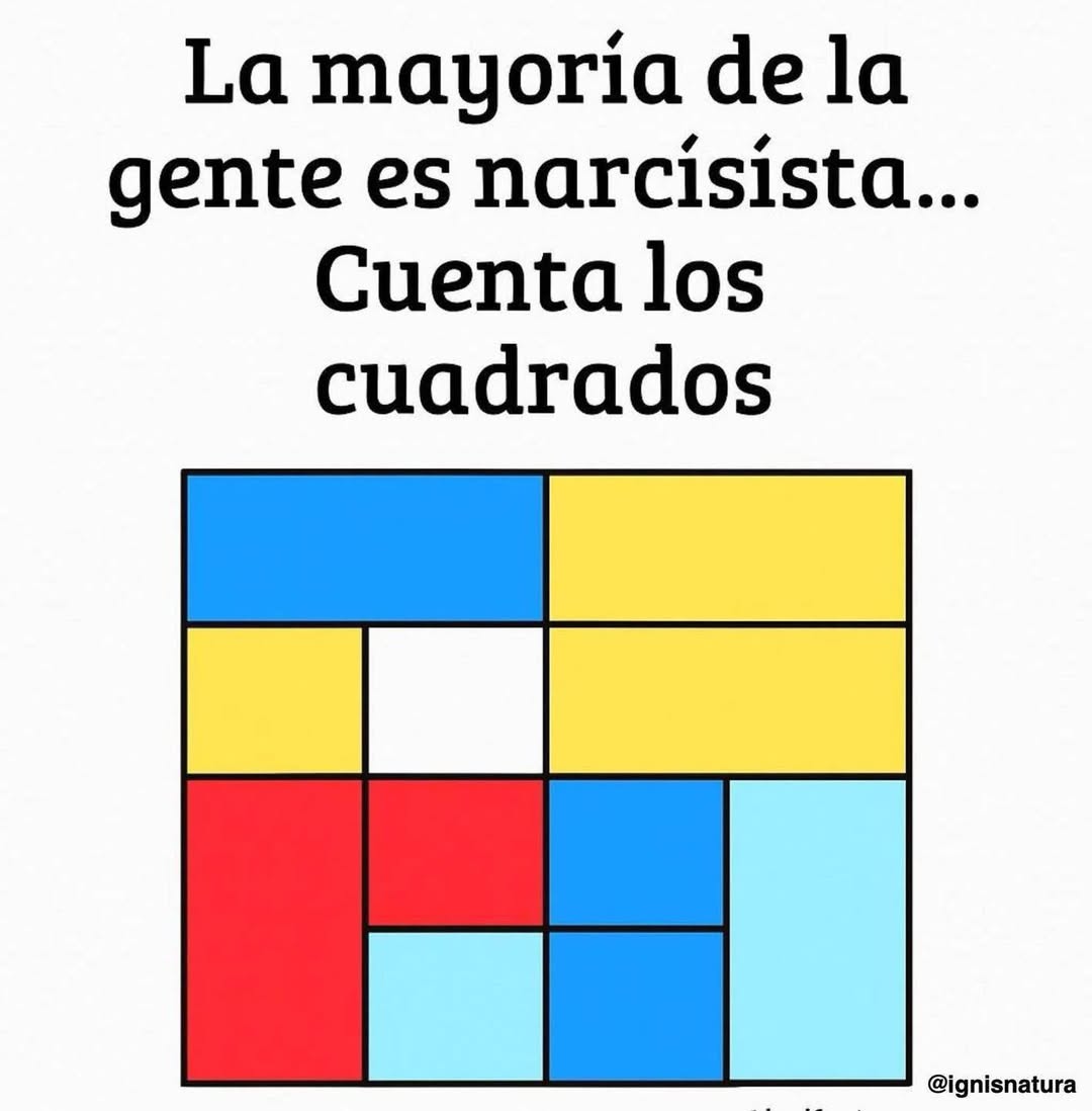 En esta imagen aparecen varios cuadrados de distintos tamaños superpuestos. Tu tarea consiste en contar cuántos cuadrados logras identificar. La idea es que el número que obtengas te brinde una pista divertida sobre si tienes ciertos rasgos de narcisismo, o si más bien tiendes a ser una persona empática y colaboradora. Recuerda que este test es meramente lúdico y no busca diagnosticarte ni etiquetarte. Se trata de reflexionar un poco sobre nuestra manera de ver el mundo y cómo podemos equilibrar nuestro propio interés con la consideración hacia los demás.