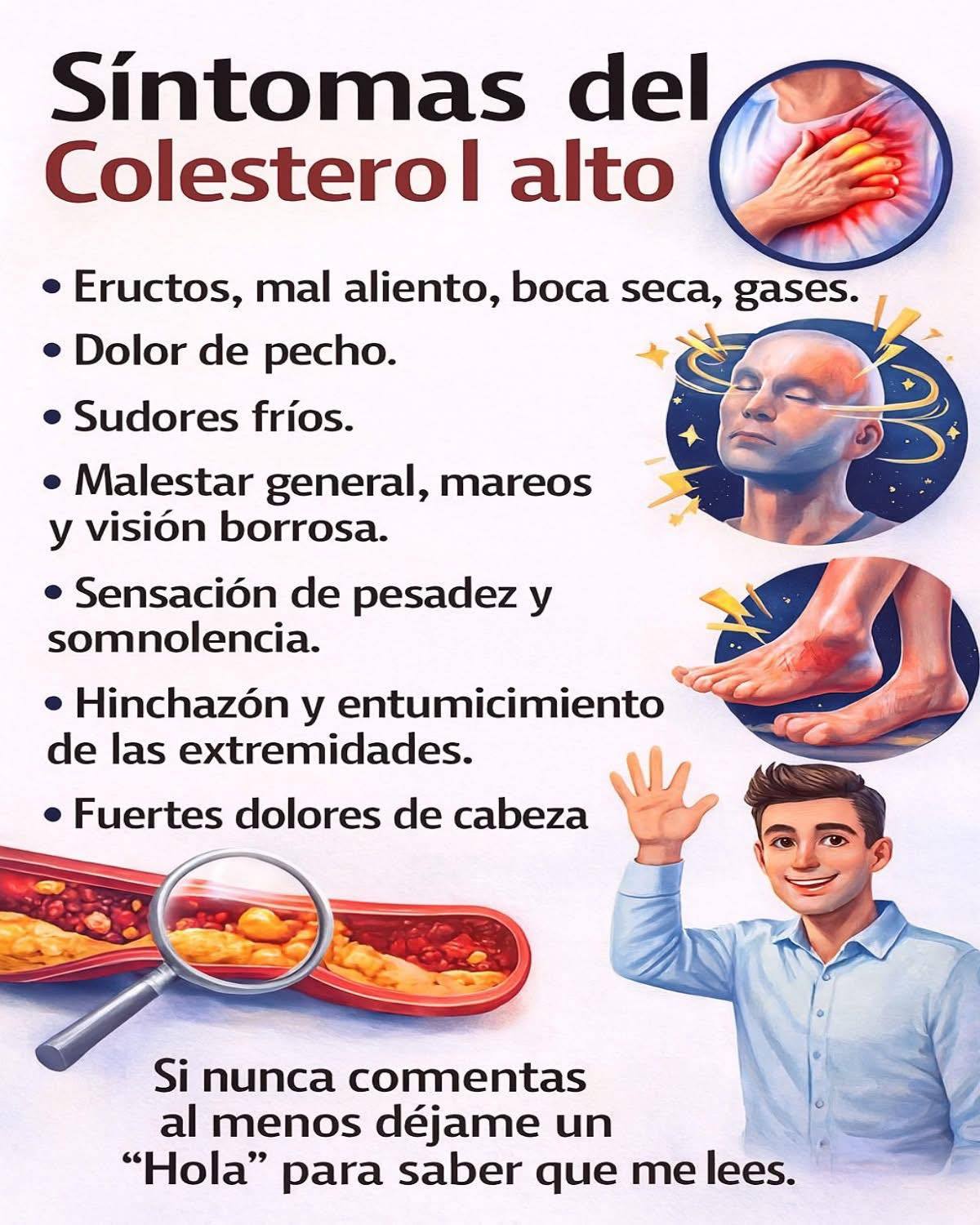 El colesterol alto por lo general no presenta sÃntomas evidentes, lo que hace que muchas personas no sepan que lo tienen hasta que se realiza un análisis de sangre o se presenta una complicación como un infarto. Sin embargo, cuando los niveles son muy altos durante mucho tiempo, pueden aparecer algunas señales o consecuencias asociadas. Estas incluyen: