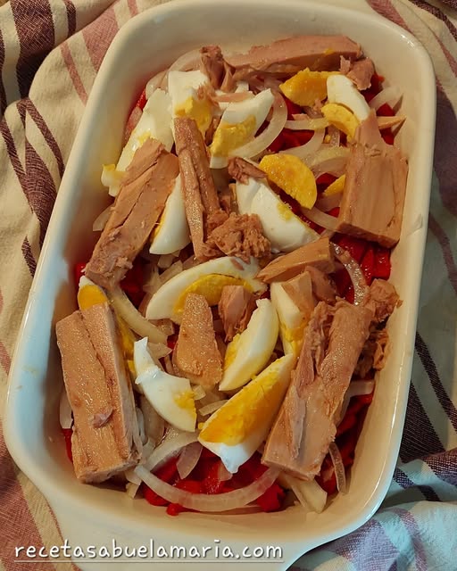 Combina ingredientes frescos y saludables —como pimientos rojos asados, cebolla, huevos y atún en aceite de oliva— en una mezcla equilibrada y deliciosa.