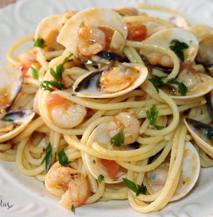 Hoy comemos pasta. Que os parece un rico plato de espaguetis con almejas y gambas, un poco diferente para salir de la rutina. Es muy fácil de hacer y además es muy sano, saludable y nutritivo.
