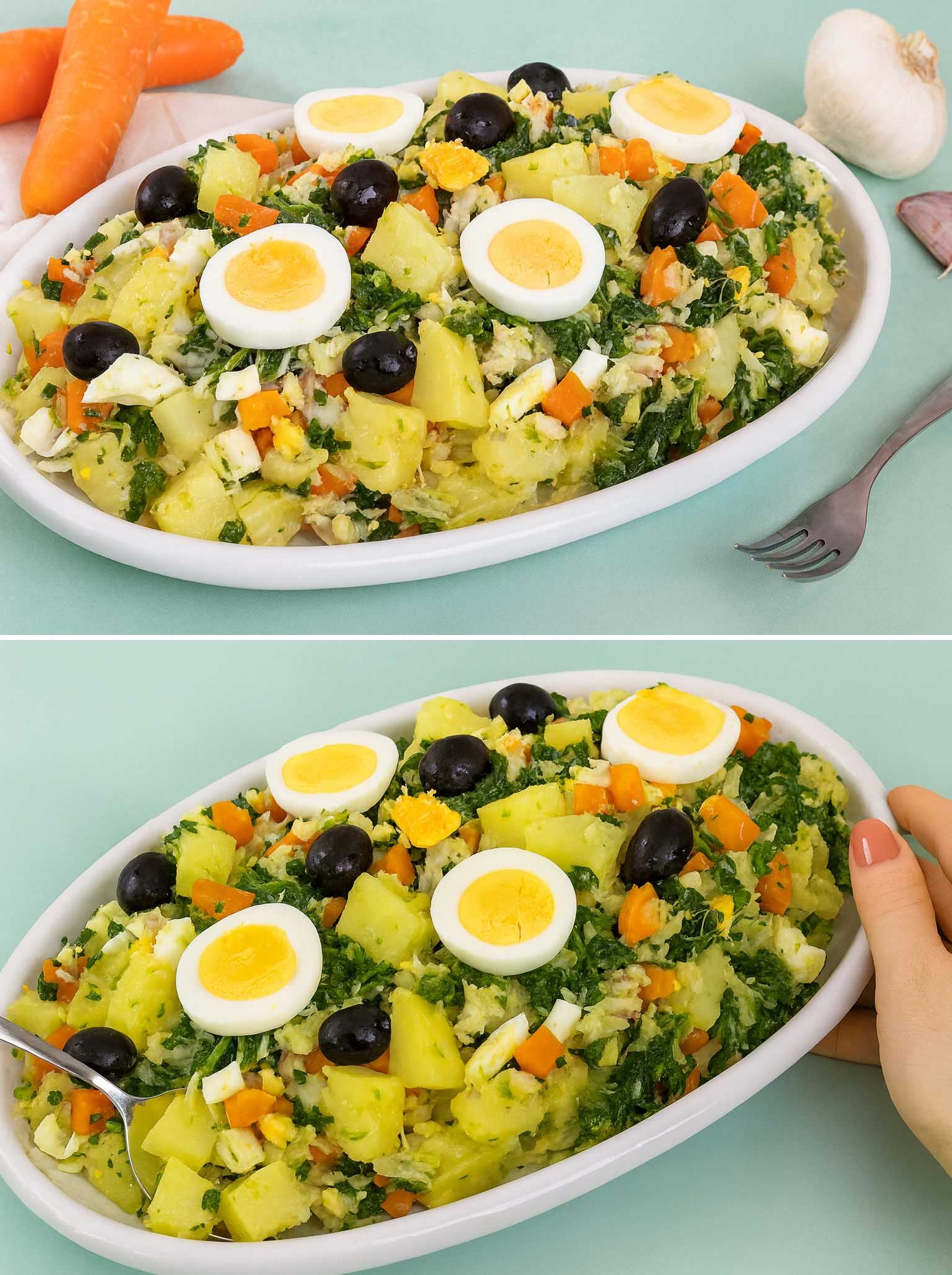 Este plato es una fuente ideal de proteínas magras, fibra y minerales, gracias a ingredientes como el bacalao, las patatas, las zanahorias, la col rizada y los huevos duros. Además, la presencia de verduras como la col rizada y las zanahorias aporta vitaminas y antioxidantes. Las aceitunas negras y el vinagre le dan un toque de sabor que lo hace aún más delicioso, mientras que el aceite de oliva virgen extra proporciona la cantidad justa de grasas saludables.