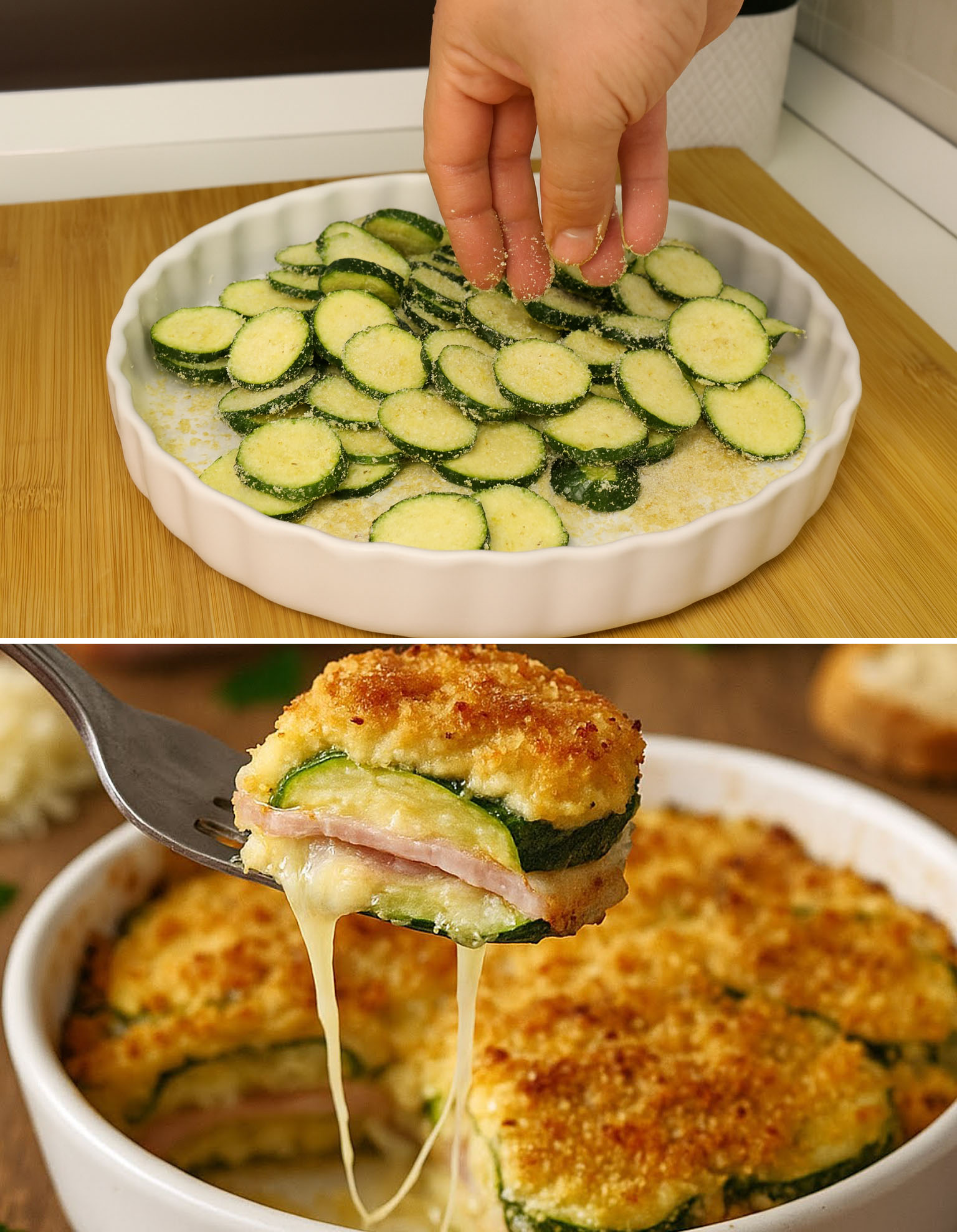 Un gratinado ingenioso con aroma a verano: rodajas de calabacín, pan rallado, parmesano y un centro de scamorza fibrosa (con jamón cocido para darle más textura). Se prepara en pocos pasos, se hornea y se disfruta solo: crujiente por fuera, tierno por dentro, perfecto como plato principal ligero o acompañado de una ensalada fresca.