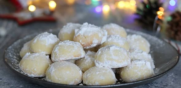 Galletas de bola de nieve fáciles, crujientes y deliciosas. Galletas navideñas fáciles y rápidas de hacer. Las galletas navideñas se preparan con ingredientes sencillos: huevos, mantequilla, harina, azúcar y almendras.