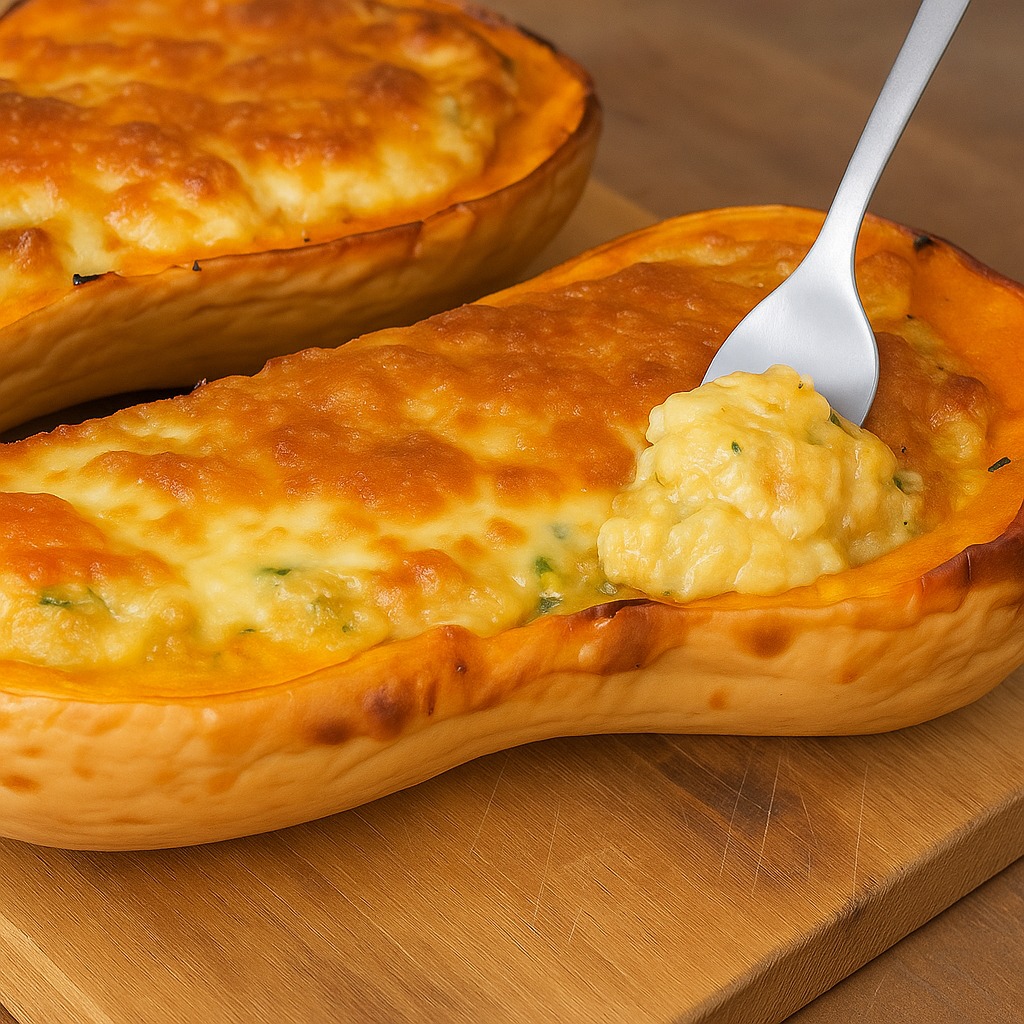 Gratinado de calabaza con salsa cremosa de champiñones.