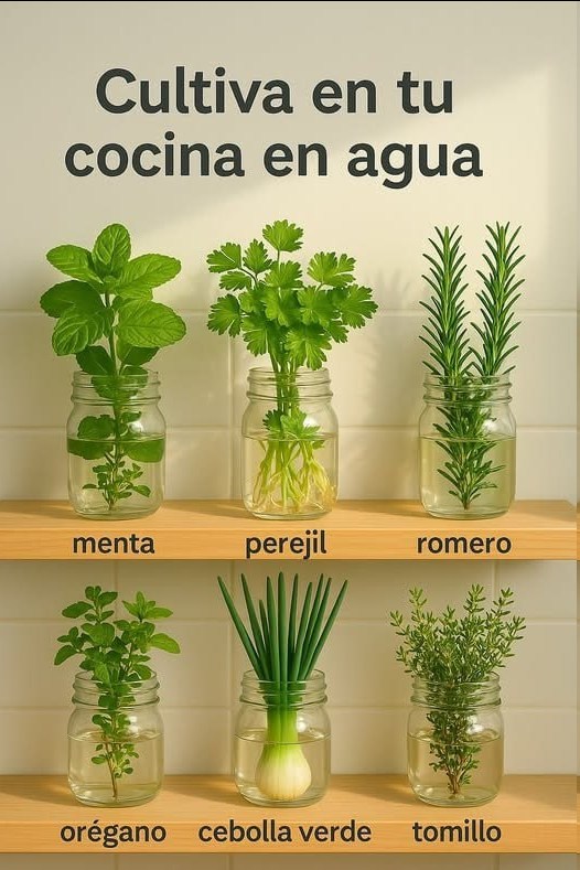 Hierbas: 10 plantas que puedes cultivar durante todo el año en agua ¿Sabías que puedes cultivar hierbas en agua ? Si no quieres llenar la cocina de tarros que puedan ensuciar los estantes con tierra, puedes “aprender” a cultivar tus hierbas aromáticas favoritas en agua. Para ello debes evitar utilizar agua del grifo . Sin embargo, si decides utilizar agua del grifo es absolutamente necesario airearla toda la noche para que el cloro se evapore . Evidentemente sería recomendable