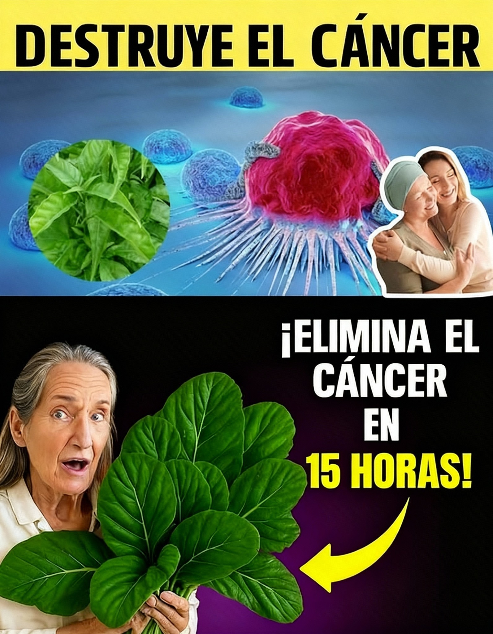 La imagen es un golpe de adrenalina y esperanza, que muestra un potente contraste: una micrografía de células cancerígenas siendo atacadas por lo que parece una hoja verde, con el testimonio emocional de una paciente y la figura de una mujer de edad (Barbara O’Neill, una polémica naturópata) sosteniendo la planta.