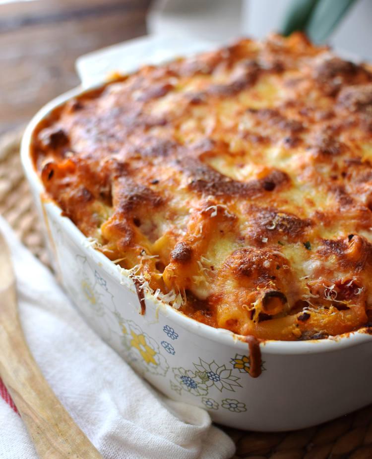 En todas las casas tienen su versión de pasta al horno, y ésta en particular está pensada en aprovechar una salsa de carne que tengamos guardada de otra oportunidad; en lugar de salsa bechamel, llevan su buena dosis de ricota.