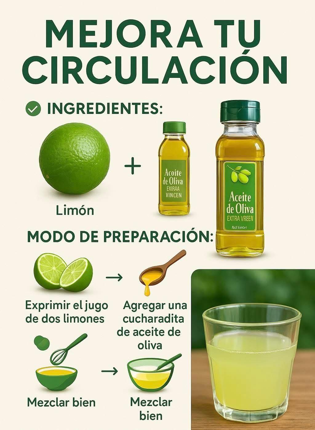 Muchas personas que sufren de mala circulaci贸n experimentan s铆ntomas como hormigueo, calambres nocturnos, pesadez en las piernas y fr铆o extremo en las extremidades. La combinaci贸n de lim贸n y aceite de oliva puede ayudar a disminuir estos malestares gracias a su efecto vasodilatador y antiinflamatorio. Adem谩s, favorece una mejor oxigenaci贸n de los tejidos y mejora el retorno venoso, lo que hace que este remedio casero sea una alternativa natural para quienes buscan fortalecer su sistema circulatorio.