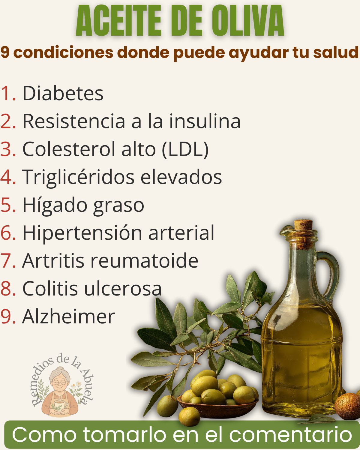 El aceite de oliva es rico en grasas saludables, especialmente ácidos grasos monoinsaturados. Estas grasas ayudan a reducir el colesterol malo (LDL) y aumentar el colesterol bueno (HDL).