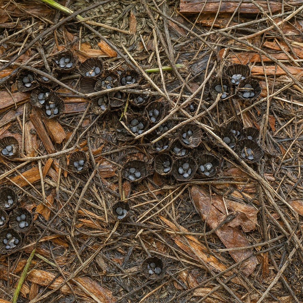 Lo que observamos en el suelo, entre el mantillo y las ramitas, era un tipo de hongo conocido como “hongo nido de pájaro” (familia Nidulariaceae). Su aspecto es exactamente el que le da su nombre: pequeñas estructuras en forma de taza o nido, dentro de las cuales parecen haber “huevitos” de color gris o plateado.