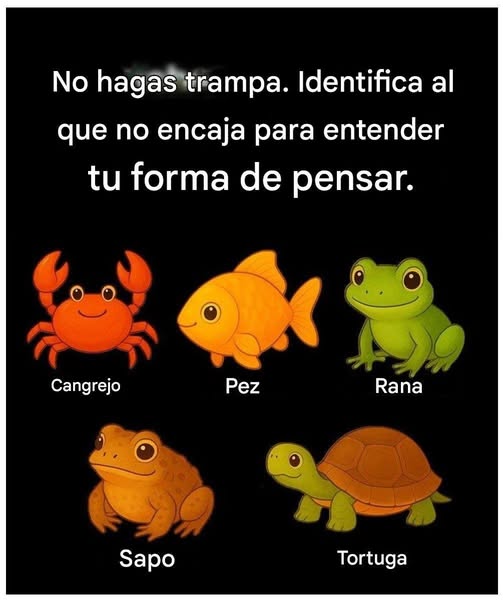 Probablemente ya te hayas topado con estos pequeños retos visuales que circulan por redes sociales: cinco animales adorables, uno peculiar… y una revelación sorprendente al final. Tras su apariencia juguetona, despiertan nuestra curiosidad: ¿por qué elegimos espontáneamente un animal en lugar de otro? ¿Qué se esconde tras este reflejo inmediato? ¿Y si tu primer instinto revela algo más de lo que crees sobre cómo observas el mundo? Antes de descubrir las interpretaciones, tómate un momento para imaginar a estos cinco compañeros: un cangrejo, un pez, una rana, un sapo y una tortuga. ¿Cuál te parece “diferente” sin pensarlo? ¡Ten en cuenta tu elección… allá vamos!