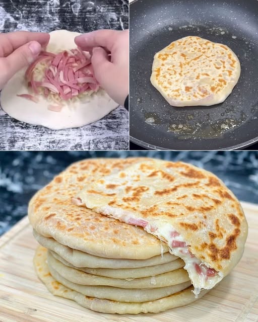 El pan plano relleno de jamón y queso es un platillo sencillo, rápido y lleno de sabor. Perfecto para una comida rápida, merienda o reunión informal. Dorado y crujiente por fuera, suave y jugoso por dentro, conquista a grandes y pequeños.