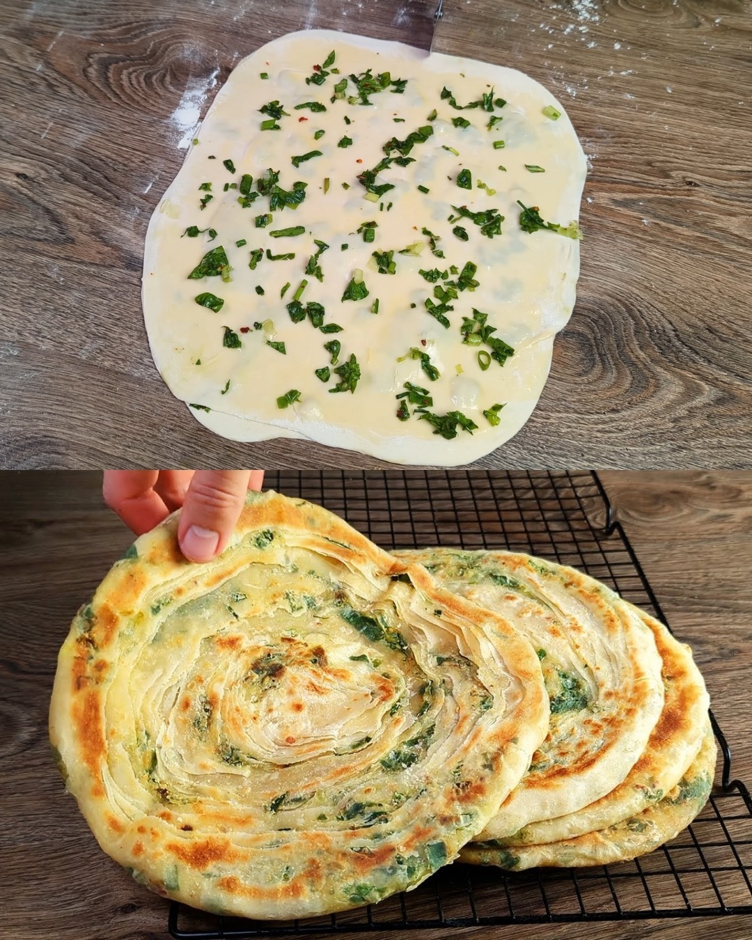 Estos sabrosos panes planos de espinaca y cebolla verde son una delicia mantecosa y hojaldrada con un rico relleno herbáceo. Perfectos para el desayuno, como refrigerio o incluso como guarnición, estos panes planos son fáciles de preparar y están llenos de sabor. Cada bocado ofrece una combinación satisfactoria de masa tierna y verduras aromáticas.