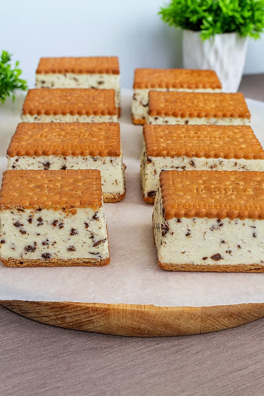 Coloca los sándwiches ya armados en una bandeja, cúbrelos con papel film o envuélvelos, y llévalos al congelador durante al menos una hora para que el helado vuelva a endurecerse.