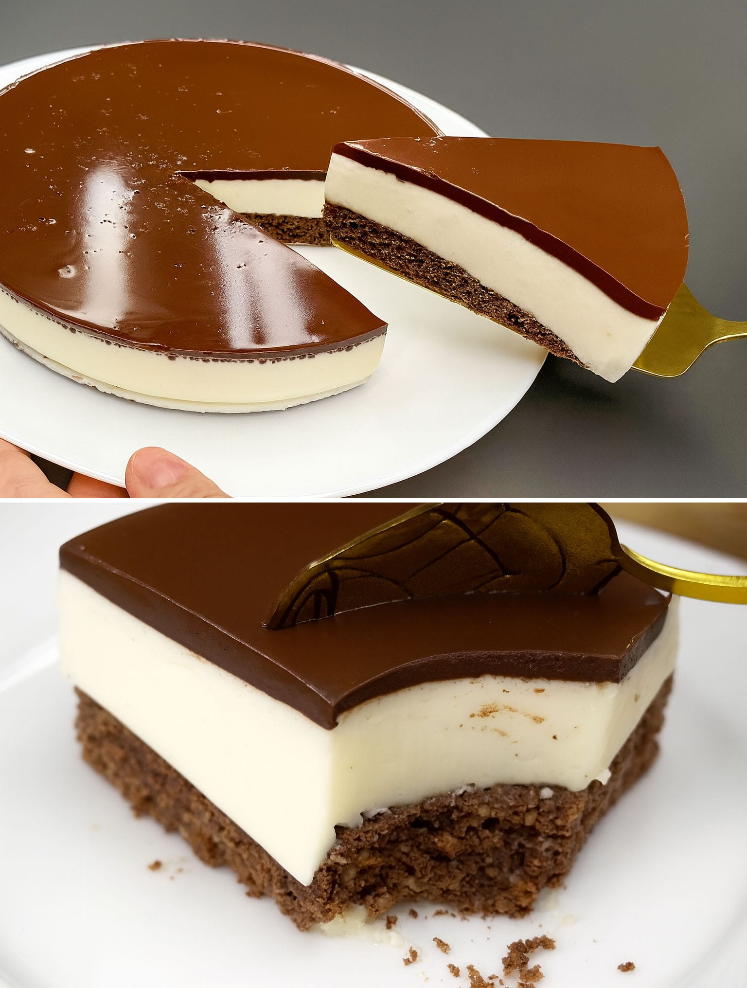 Este es mi pastel favorito cuando quiero algo fresco pero ligero. La base es fina y con un ligero sabor a nuez (gracias a las nueces), la crema es una mezcla ligera de leche y ricotta, suave y cremosa, y por encima lleva un glaseado de cacao que se extiende como la seda. Es muy sencillo: se hornea la base y luego la nevera hace el resto. Lo corto en porciones pequeñas y lo guardo en la nevera: siempre se acaba antes de lo esperado… ¡cosas de la física!