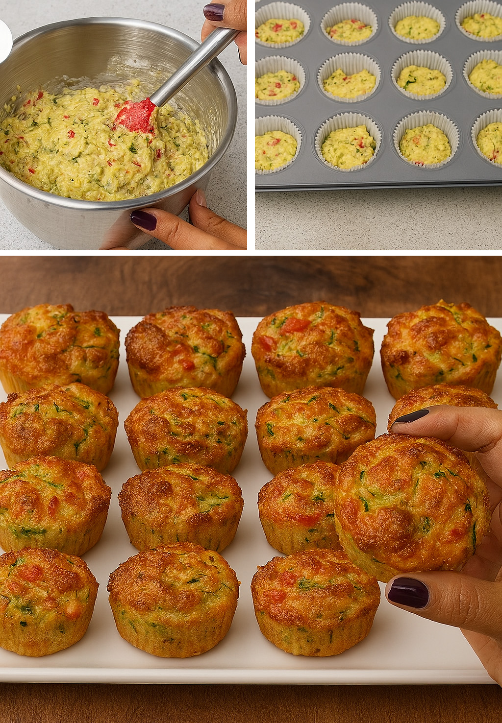 Los preparé improvisadamente solo para vaciar la nevera, y… ¡sorpresa! Quedaron deliciosos. Suaves, sabrosos, perfectos para comer calentitos recién salidos del horno, pero también al día siguiente: los caliento 30 segundos en el microondas. No llevan mantequilla, ni embutidos, ni ingredientes pesados; solo verduras, huevos, un poco de harina y queso. También puedes personalizarlos con lo que tengas (como zanahorias, calabacín, cebolla, aceitunas, etc.), pero esta versión básica ya es un éxito, en mi opinión.
