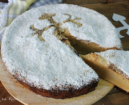 Básicamente está elaborada con almendra molida mezclada con huevos y azúcar a partes iguales y como detalle final se espolvorea con azúcar glas sobre una plantilla de la Cruz de Santiago, para que al retirarla quede impresa.