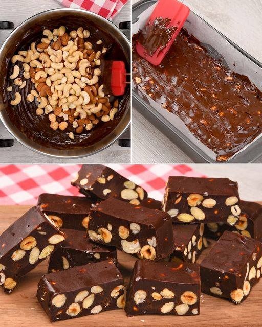 Rico, con sabor a chocolate y con la cantidad justa de crujiente: el turrón de caramelo es el refrigerio perfecto para tener a mano cuando te apetezca algo dulce. Este postre fácil sin hornear es rico en sabor a chocolate, con la cantidad justa de crujiente de las nueces y la dulzura de la miel y la leche condensada. No es para los pusilánimes, ¡pero a los golosos les encantará! Solo necesitas cuatro ingredientes para prepararlo (chocolate, miel, leche condensada y frutos secos). Simplemente derrita el chocolate, agregue el resto de los ingredientes y mezcle. ¡Es súper fácil y delicioso! No podrás detenerte en uno.